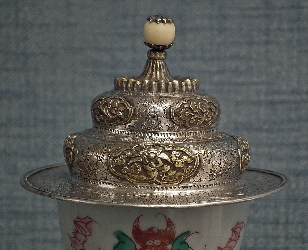Antique Buddhist Dhakya Silver Cup Stand with Cover 19th century Tibet